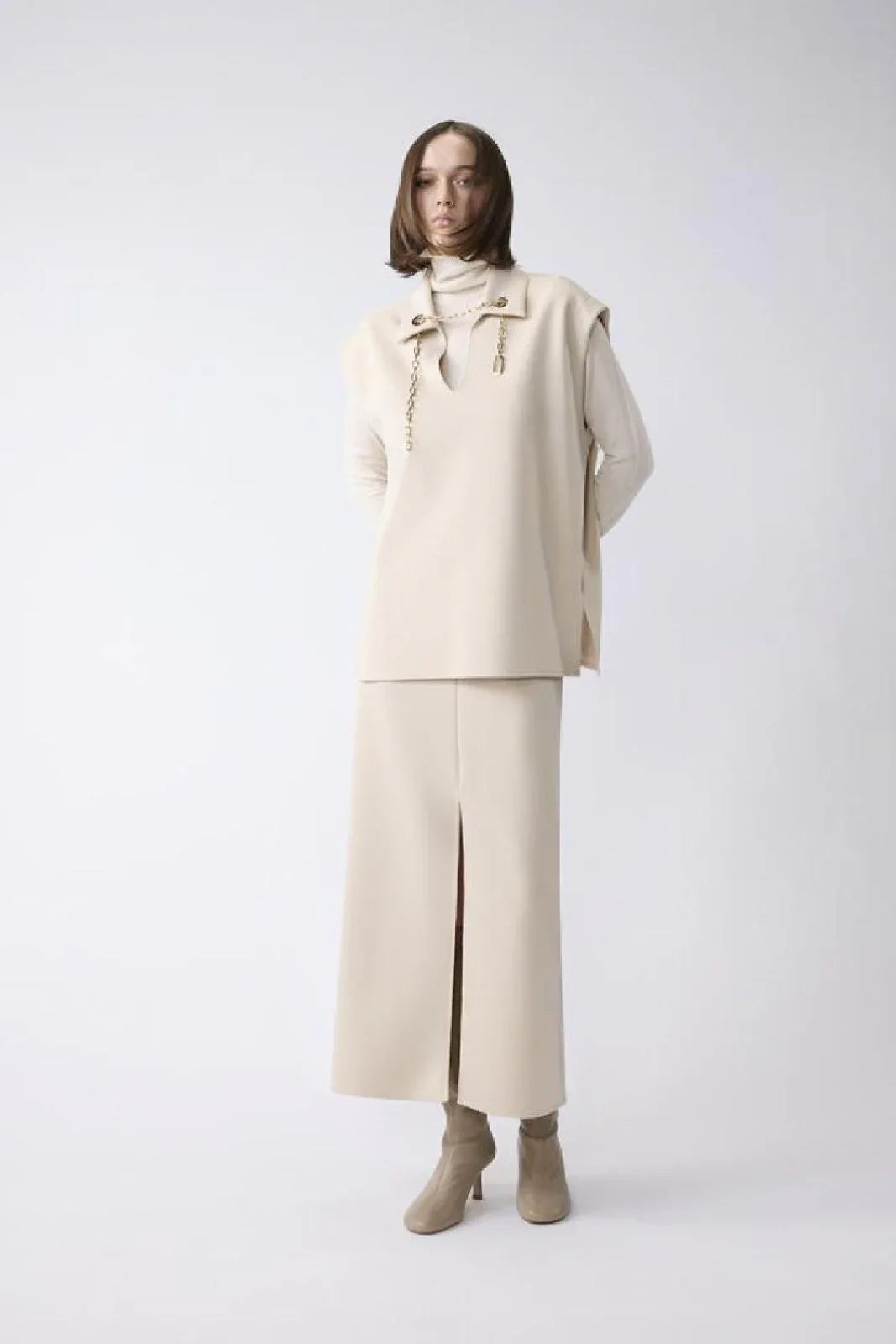Questa gonna beige è realizzata in tessuto tecnico misto poliestere ed elastan, offrendo resistenza, elasticità e un fit sempre perfetto. Le sue linee casual sono pensate per la stagione Autunno/Inverno e consentono creazioni sempre nuove, dallo stile casual chic a quello più elegante. Leggera, facile da abbinare e con una cura sartoriale nei dettagli, rappresenta una scelta intelligente per ogni guardaroba femminile.